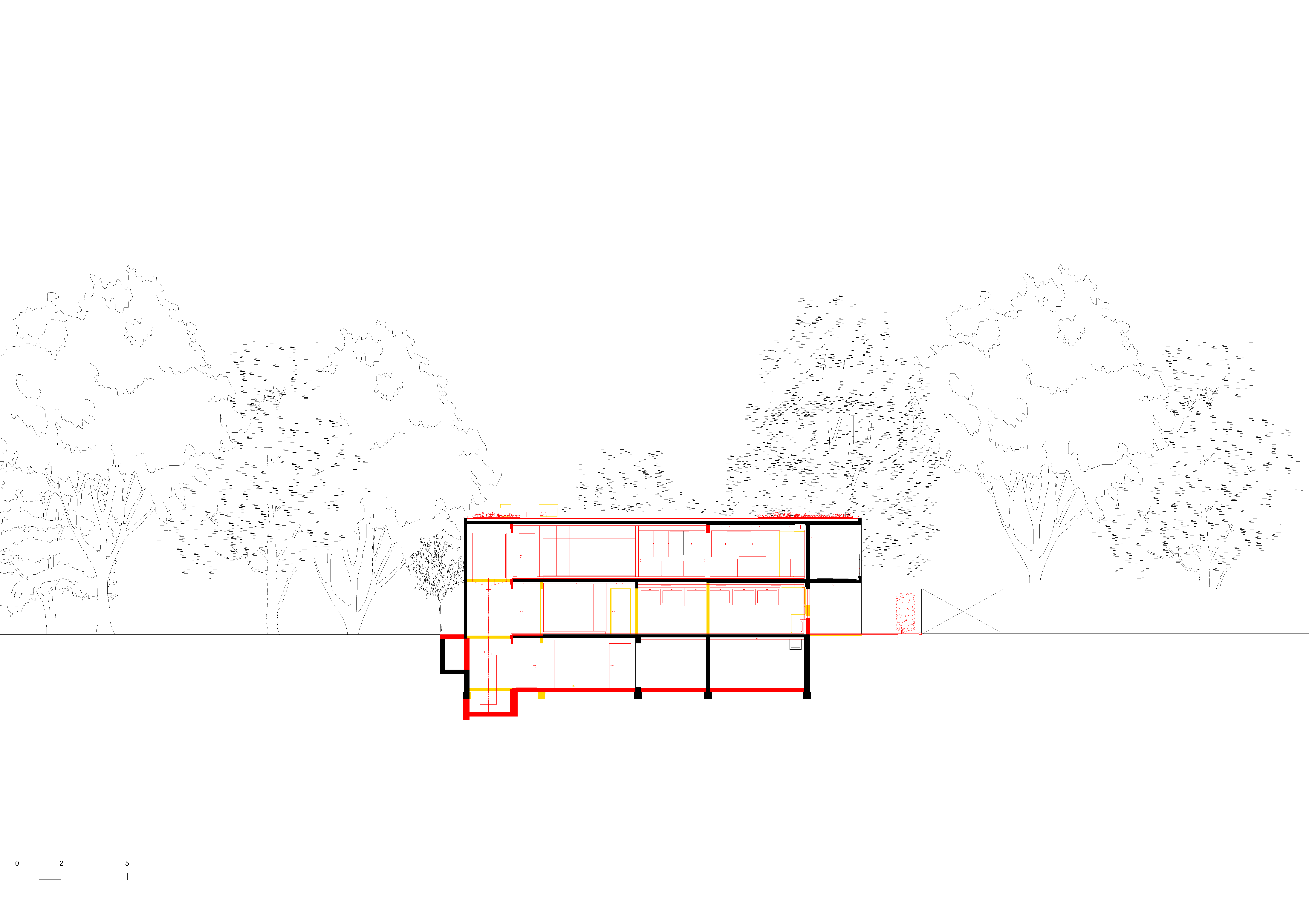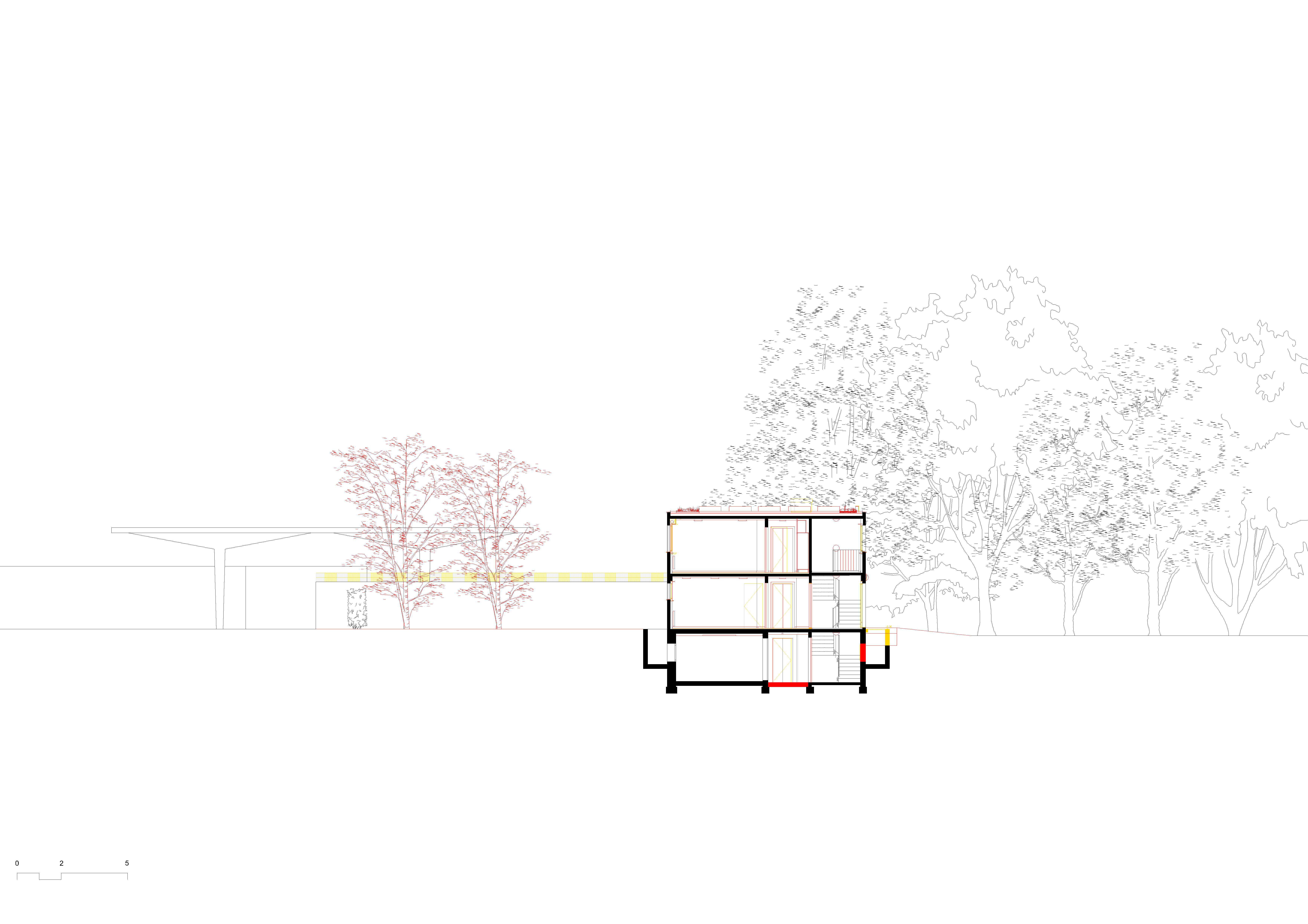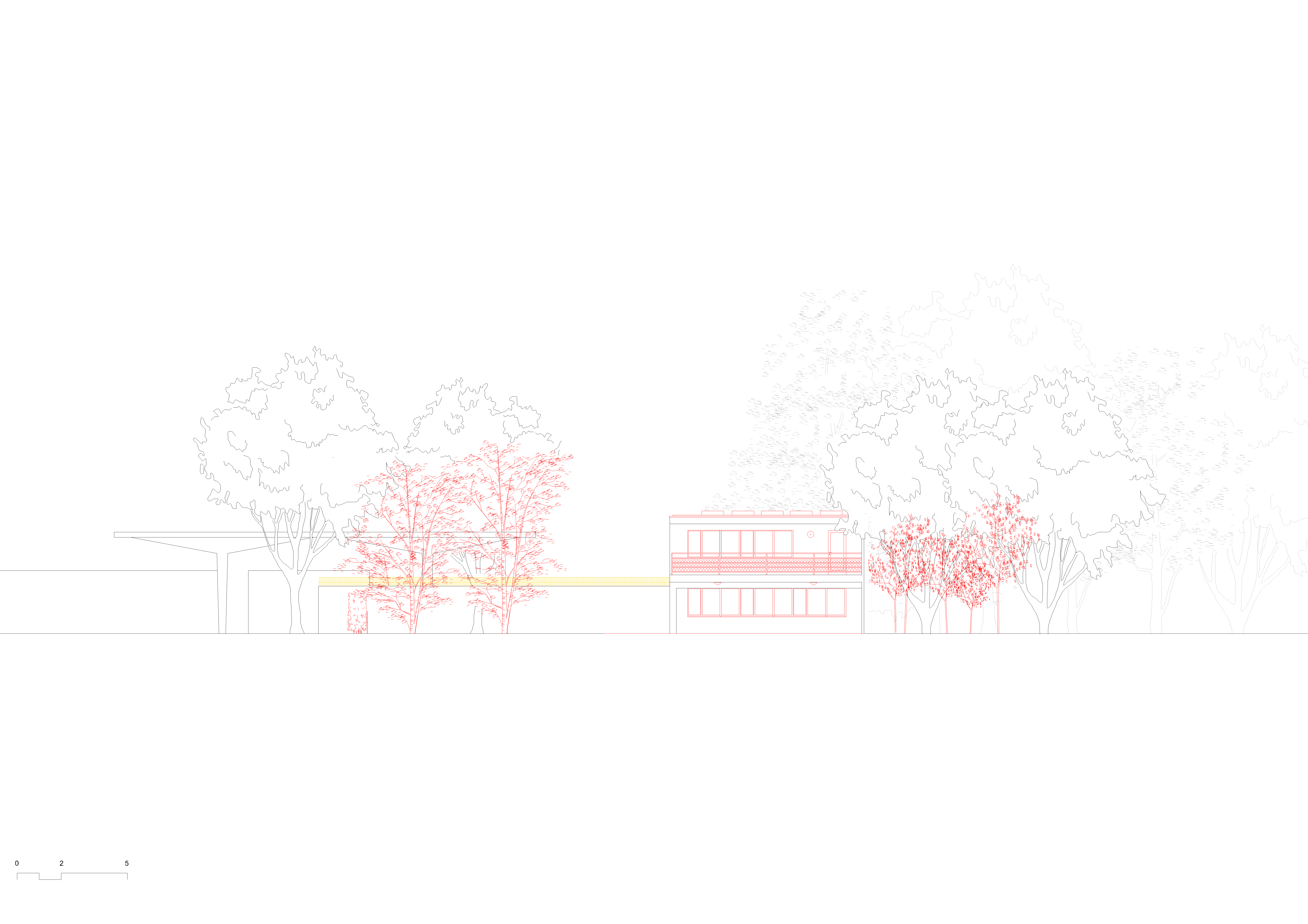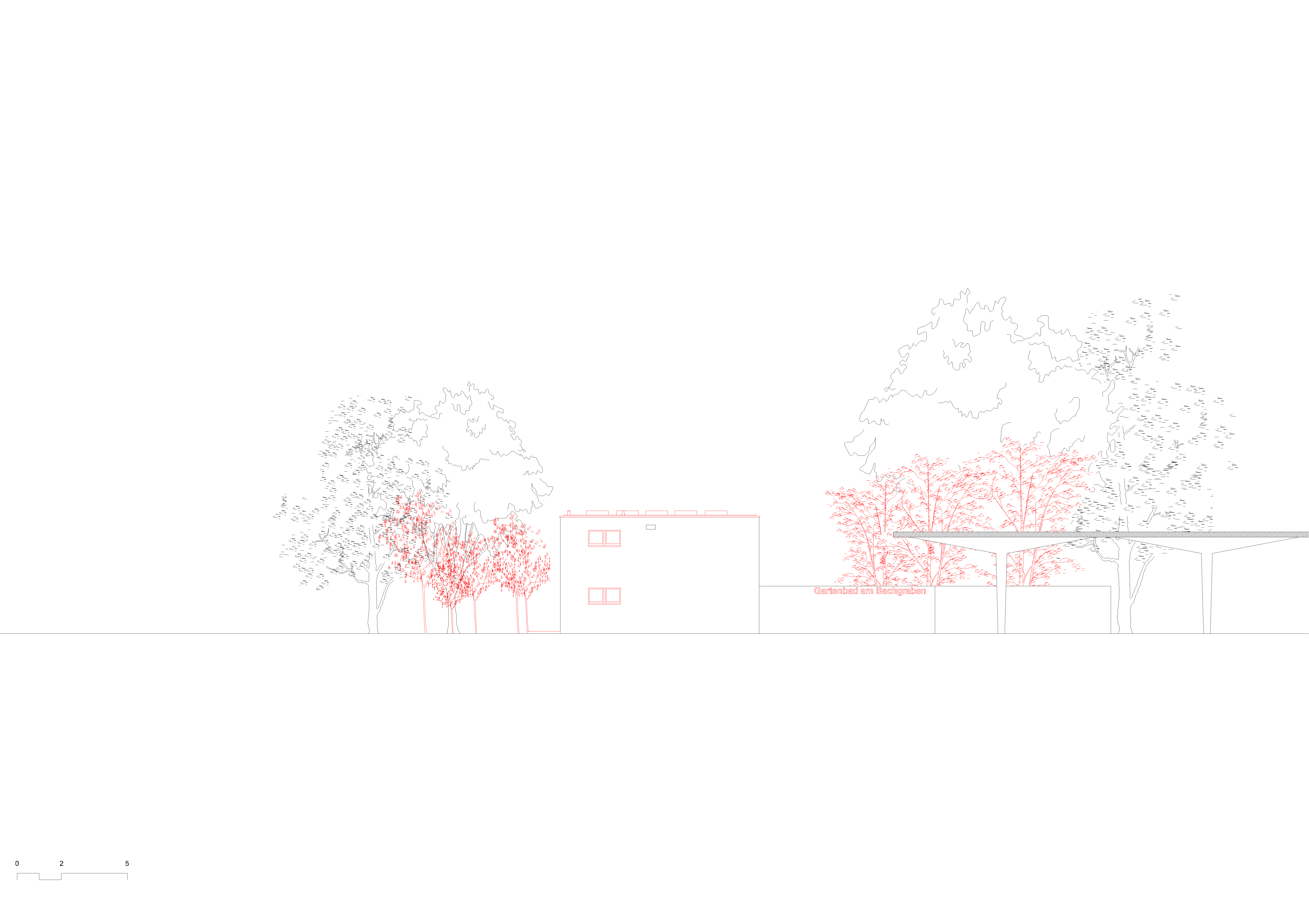 Das Gartenbad Bachgraben wurde 1962 nach den Plänen von Otto und Walter Senn erbaut. MET Architects konnten den offenen Wettbewerb für die Sanierung des denkmalgeschützten Restaurantgebäudes, in das auch ein Jugendzentrum integriert werden sollte, für sich entscheiden. Weil das Gebäude ursprünglich nur für den Sommerbetrieb ausgelegt war und eine Ertüchtigung für eine ganzjährige Nutzung die historische Substanz erheblich beeinträchtigt hätte, schlugen sie das ehemalige Abwartshaus als alternativen Standort vor. Neu sind dessen drei Geschosse durch einen Lift hindernisfrei miteinander verbunden. In beiden oberirdischen Geschossen wurden in der nördlichen Ecke geschlechtergetrennte Toiletten eingebaut. Im EG wurden mehrere Wände abgebrochen und wo notwendig das Tragsystem mit neuen Stützen wiederhergestellt, wodurch zwei grosse Gruppenräume mit direktem Gartenzugang entstanden. Im Obergeschoss wurden die ehemalige Küche und das Wohnzimmer zu einem weiteren Gruppenraum verbunden.